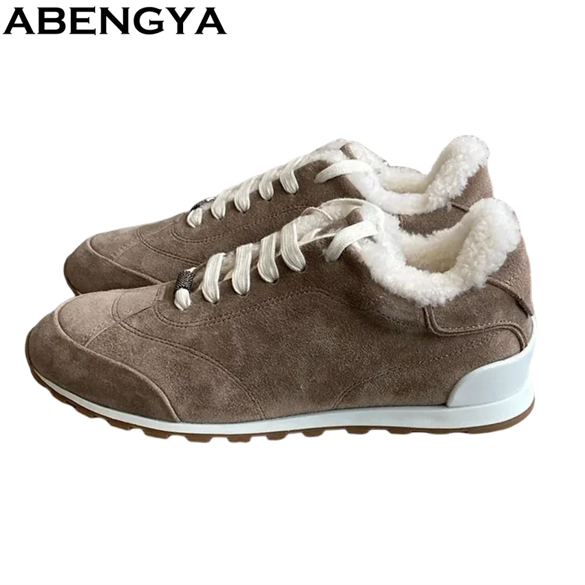ABENGYA Winter Lace Up Wool Flat Casual Shoes Women Platform Sneakers Suede Leather Warm Shoes Ladies String Bead Walk Shoes