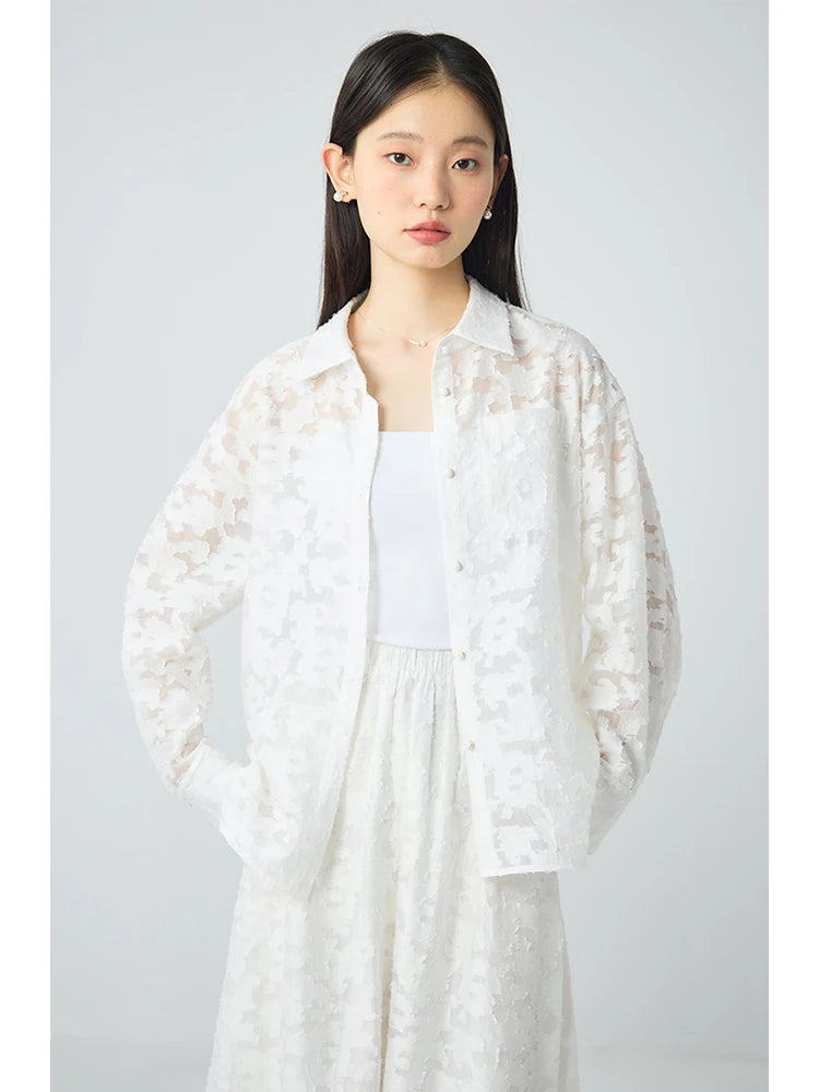 ZIQIAO Women White Shirt Sets Summer Sets Long Sleeve Blouses High Waist Elastic Waist A-LINE Skirts 24ZQ92255+24ZQ92256