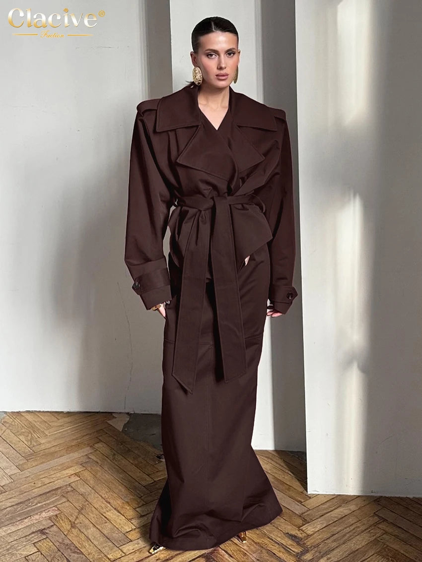 Clacive Fashion Loose Khaki 2 Piece Set Women 2025 Elegant Long Sleeve Shirt With High Waist Maxi Skirt Set Female Clothing