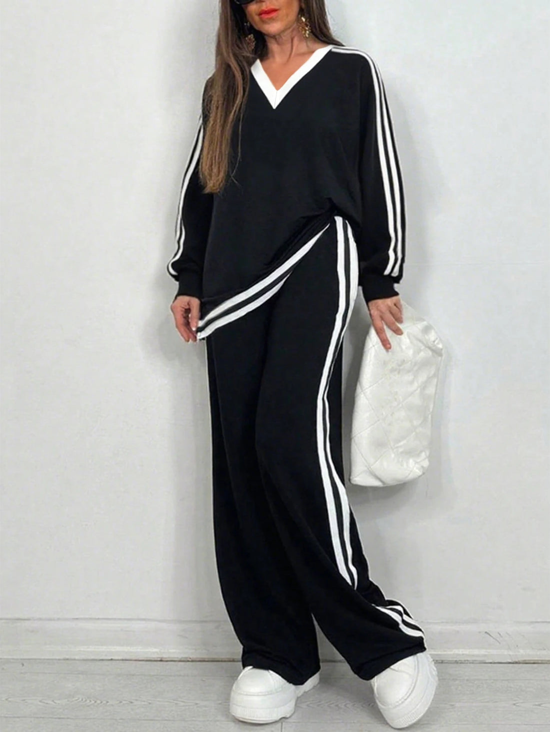 Plus-size fashion suitable for sports daily leisure V-neck hem slit simple solid color long sleeve set