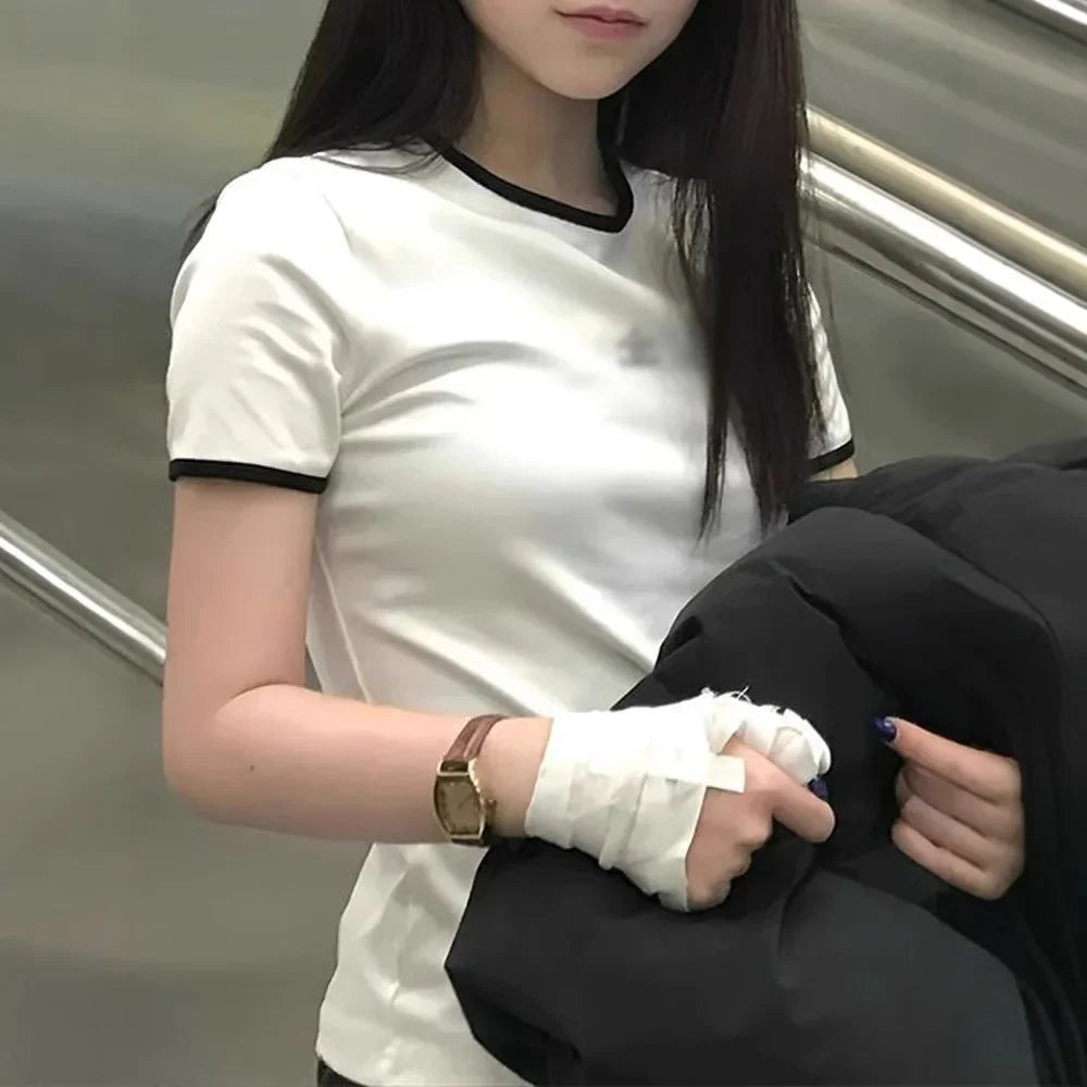Red Slim Fit Short Sleeve T-Shirt Women's Design Sensation Summer Fashion Sweet And Spicy Girl Shoulder Length V-neck Top