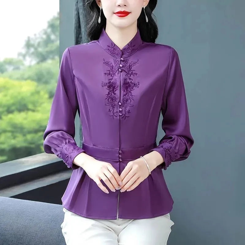 Embroidery Silk Shirt Women 2025 Spring Summer New Fashion Stand-Up Collar Blouse Mom Jacket Ladies Waist Outerwear Tops T1290