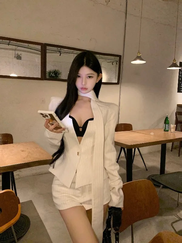 Korean Sweet Hot Suit Women's Spring Stripe Long-sleeved Coat High Waist A-line Shorts Two-piece Set Fashion Female Clothes
