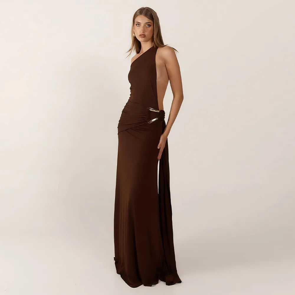 Brown One Shoulder Backless Long Dress Sexy Women's Metal Buckle Ruched Dresses Summer Evening Wedding Guest Cocktail Black Grey