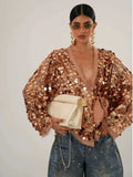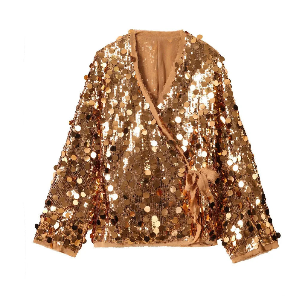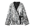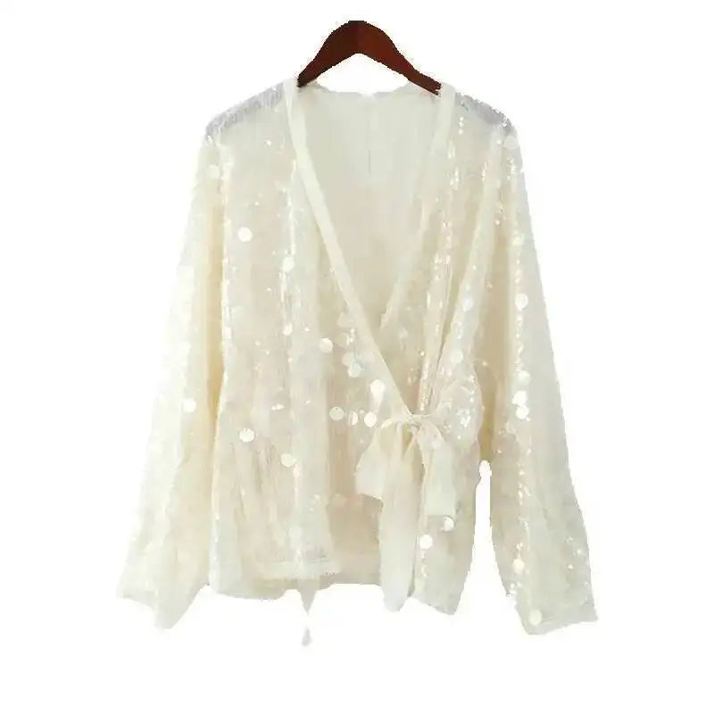 Five Colors Elegant White Sequ Patchwork Lace-up Shirt Blouse Women Long Sleeve V-neck Loose Short Coats Street Overshirt M4XW