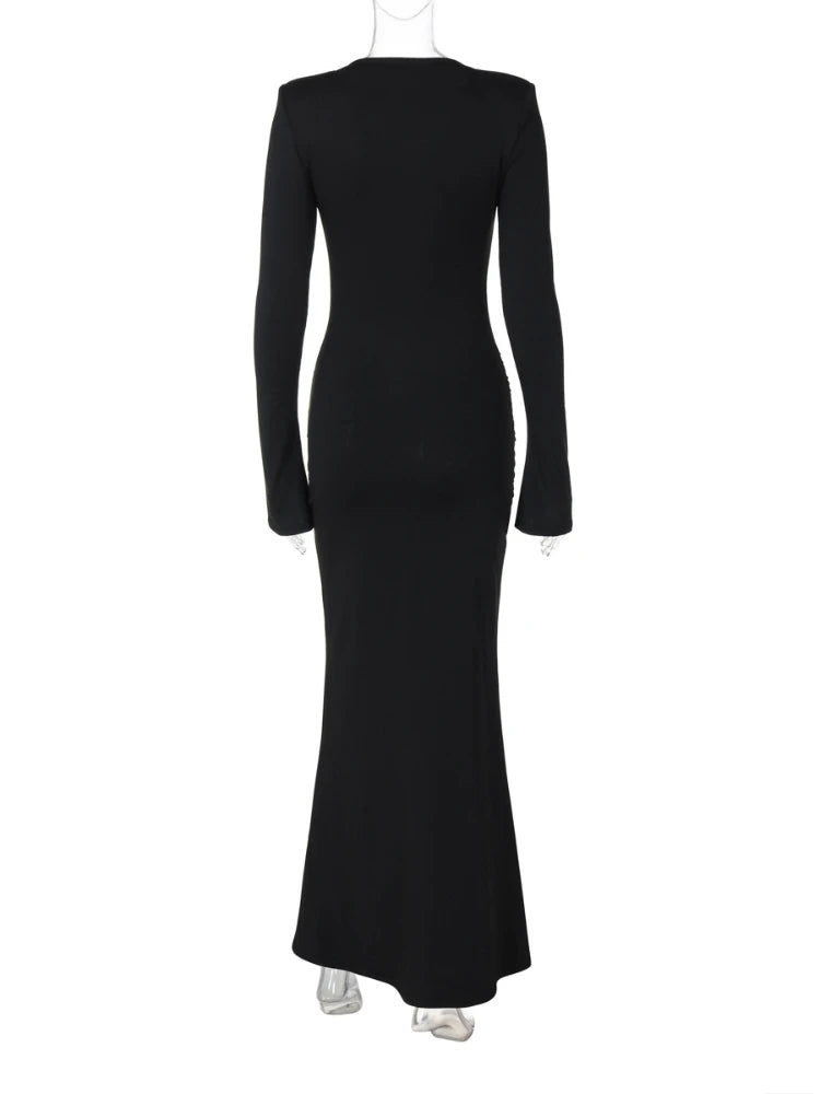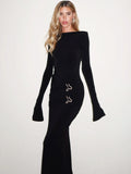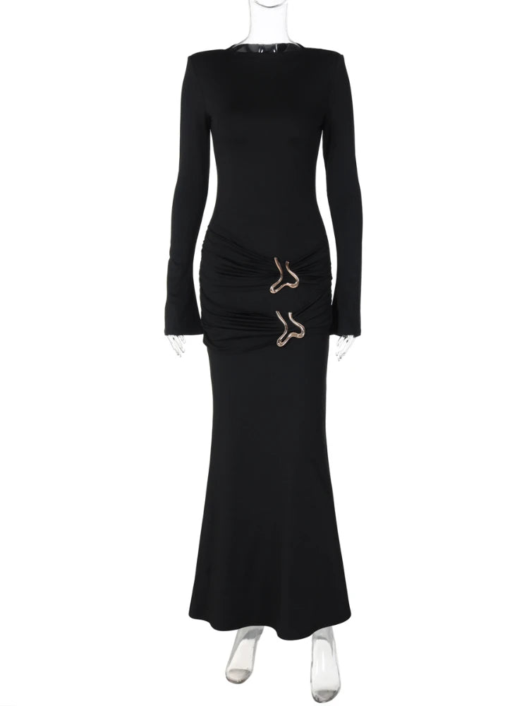 Leosoxs Elegant Vintage Dress Women Fall Flared Full Sleeve Metal Buckle Pleats Solid Casual Simple Trend Skinny Long Bodycon