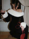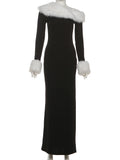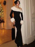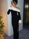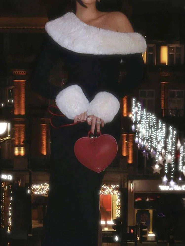Nibber Elegant Christmas Party Maxi Dress Woman Furry Patchwork Winter Trend Skew Collar Full Sleeve Skinny Robe Style Vestidos